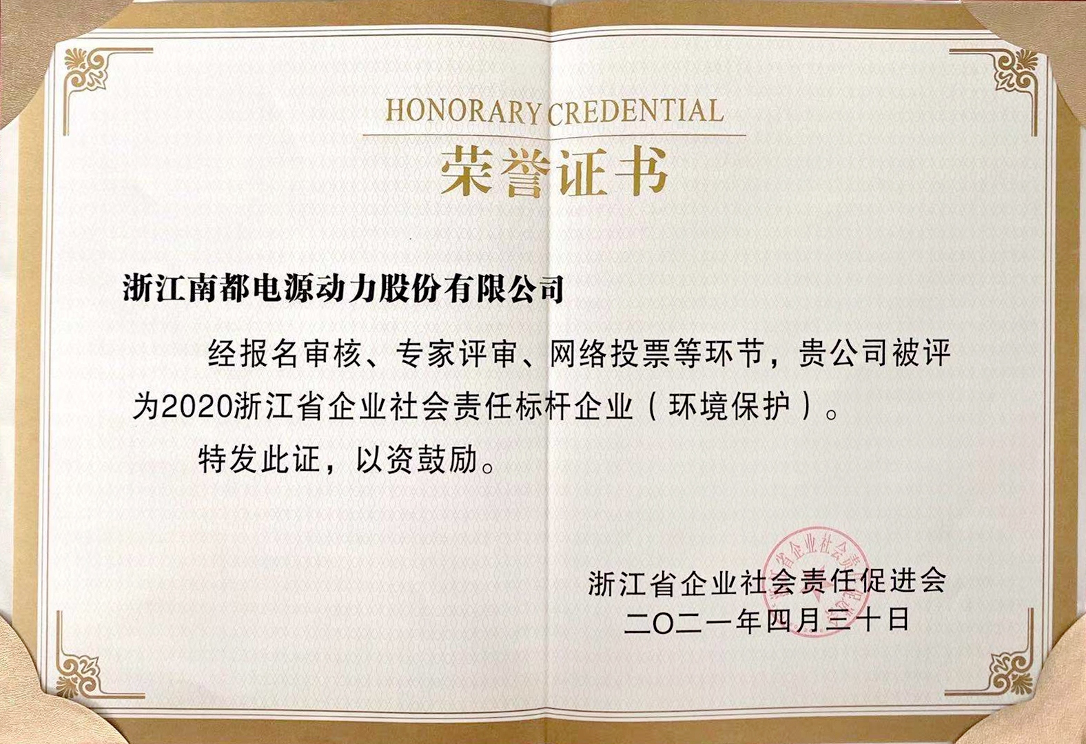 浙江省企业社会责任促进会成立于 2015 年,是一家全省性、非营利性、联合性、自愿结成的社会组织机构。本次评选活动经报名审核、专家评审、网络投票等环节,共 32 家单位被评为 2020 浙江省企业社会责任标杆企业。
