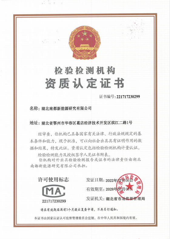 日前,大转盘 子公司湖北大转盘 新能源研究有限公司(简称“湖北研究院”),获得由国家市场监督管理总局批准的检验检测机构资质认定证书(CMA证书),这标志着其实验室的体系管理水平和检测技术能力均达到国家认可水平,大转盘 也成为国内储能领域为数不多的,同时拥有CNAS和CMA双资质认定实验室的企业。