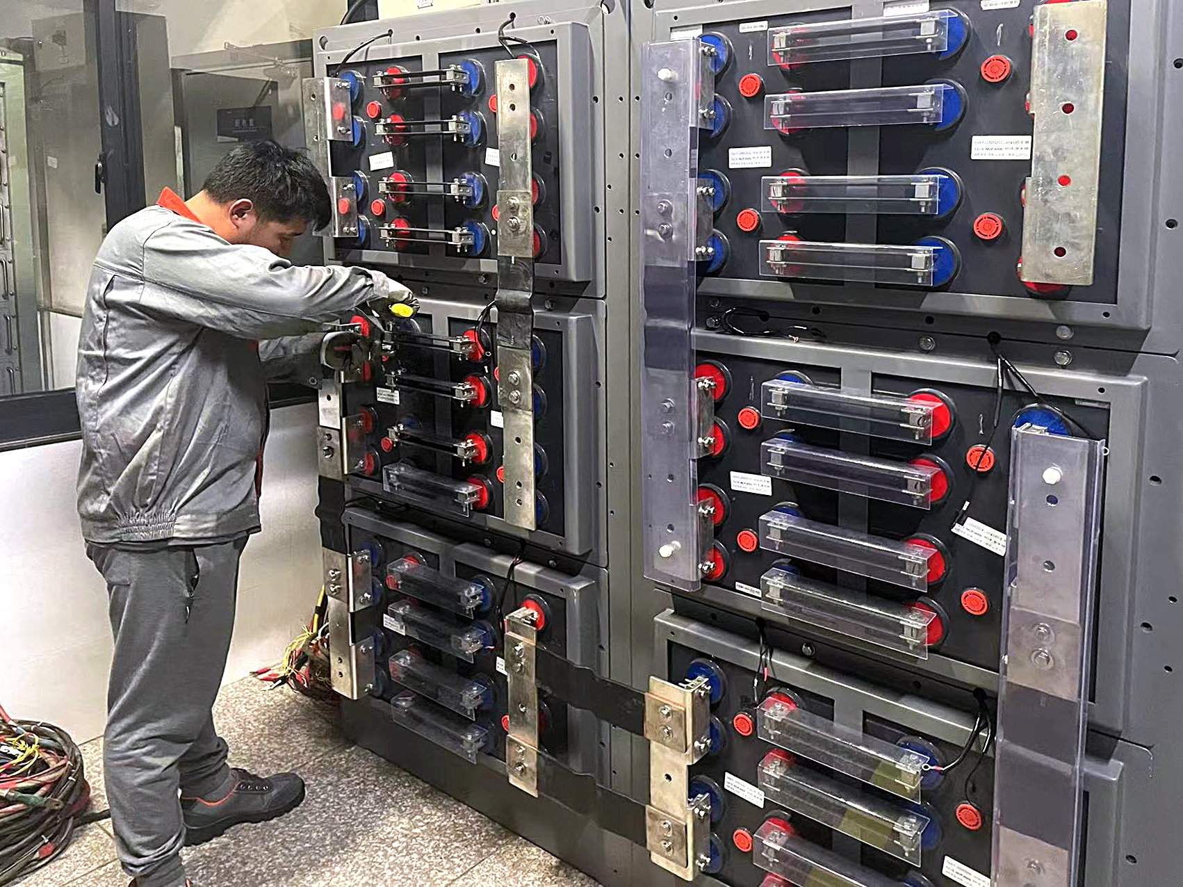 CAP1400 1E 级阀控蓄电池单只重量达375kg,日常的高温试验也因此变得极具挑战。高温试验需要把电池一只只垒放到高达1.7米的铁架上,铁架虽然经过了加固改造,但因为核电电池重量的“非经验性”,首次实验时,在场的所有人还是紧张地摒住了呼吸。