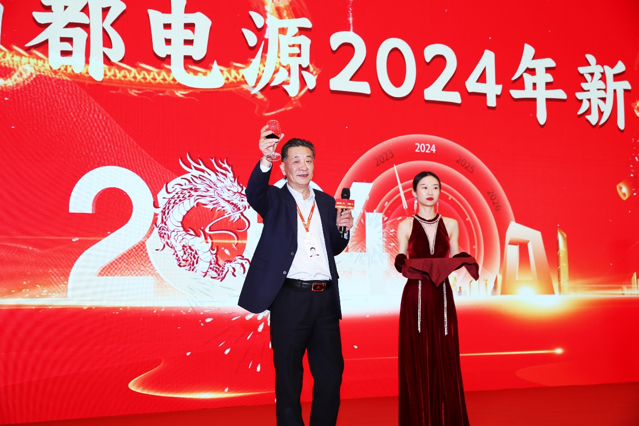 公司副董事长王岳能在晚会上致新春贺词。他感谢了全体大转盘 人在2023年的辛勤付出。新的一年里,希望全体员工在朱保义董事长的带领下,凝心聚力、砥砺前行,全面完成2024年的各项指标,再创大转盘 辉煌的30年!随后,王岳能副董事长在台上与全体员工共同举杯贺新春。