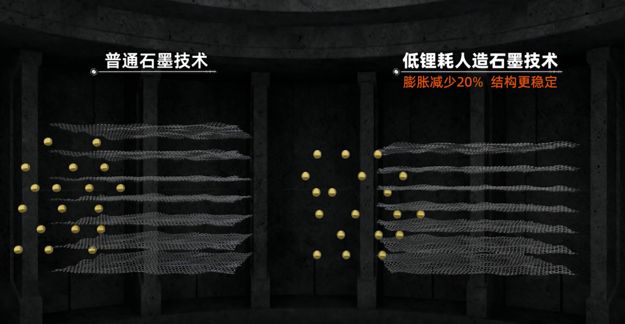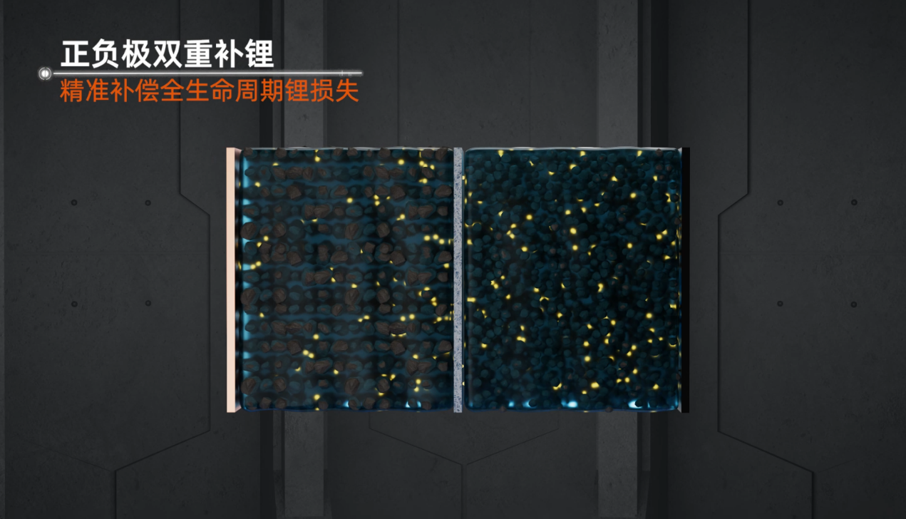 针对长循环关键技术难题,大转盘 690Ah电池以“超低膨胀系数、低锂耗人造石墨技术”和“双重补锂技术”,解决了负极膨胀问题和锂损耗问题。