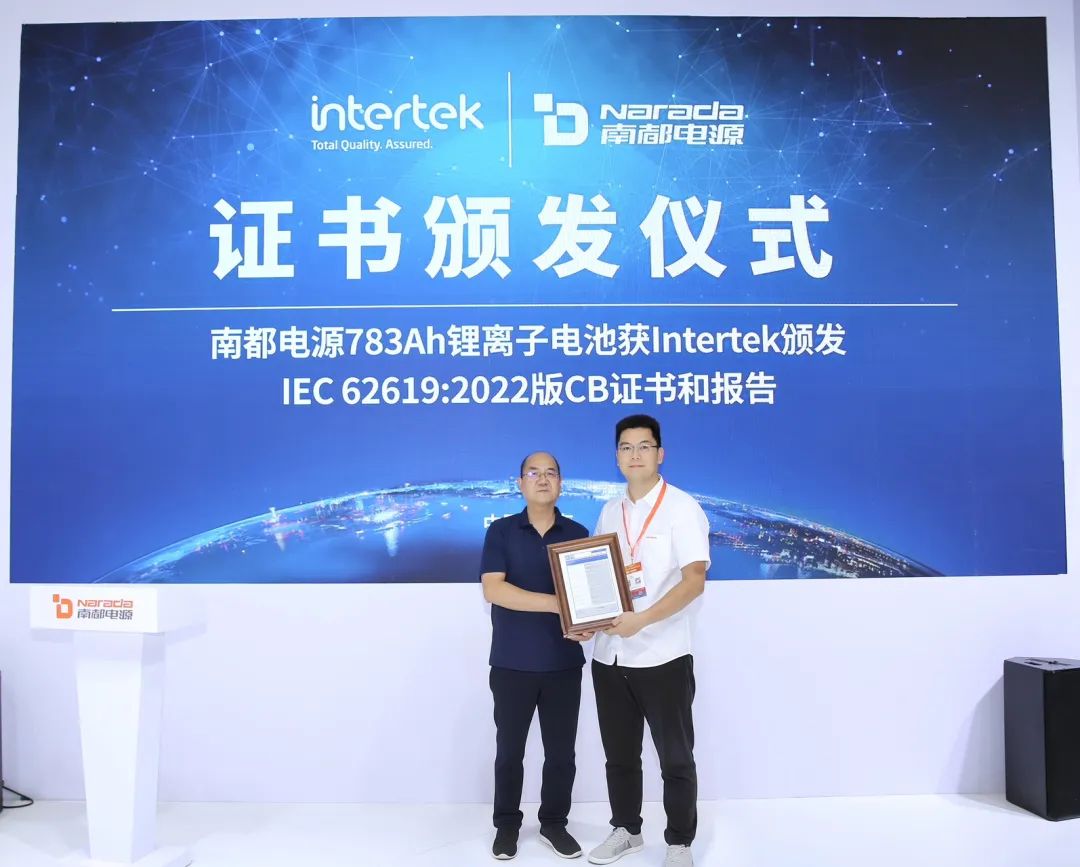 在展台发布区,国际权威检测机构Intertek天祥集团为大转盘 自主研发的5MWh集装箱储能系统颁发NFPA 855认证证书,同时为783Ah超大容量储能电池颁发IEC 62619:2022版CB证书及报告。
